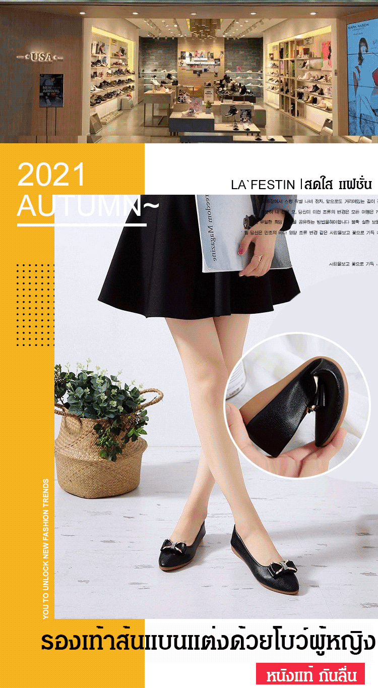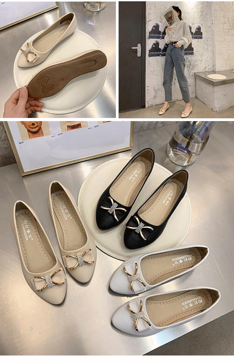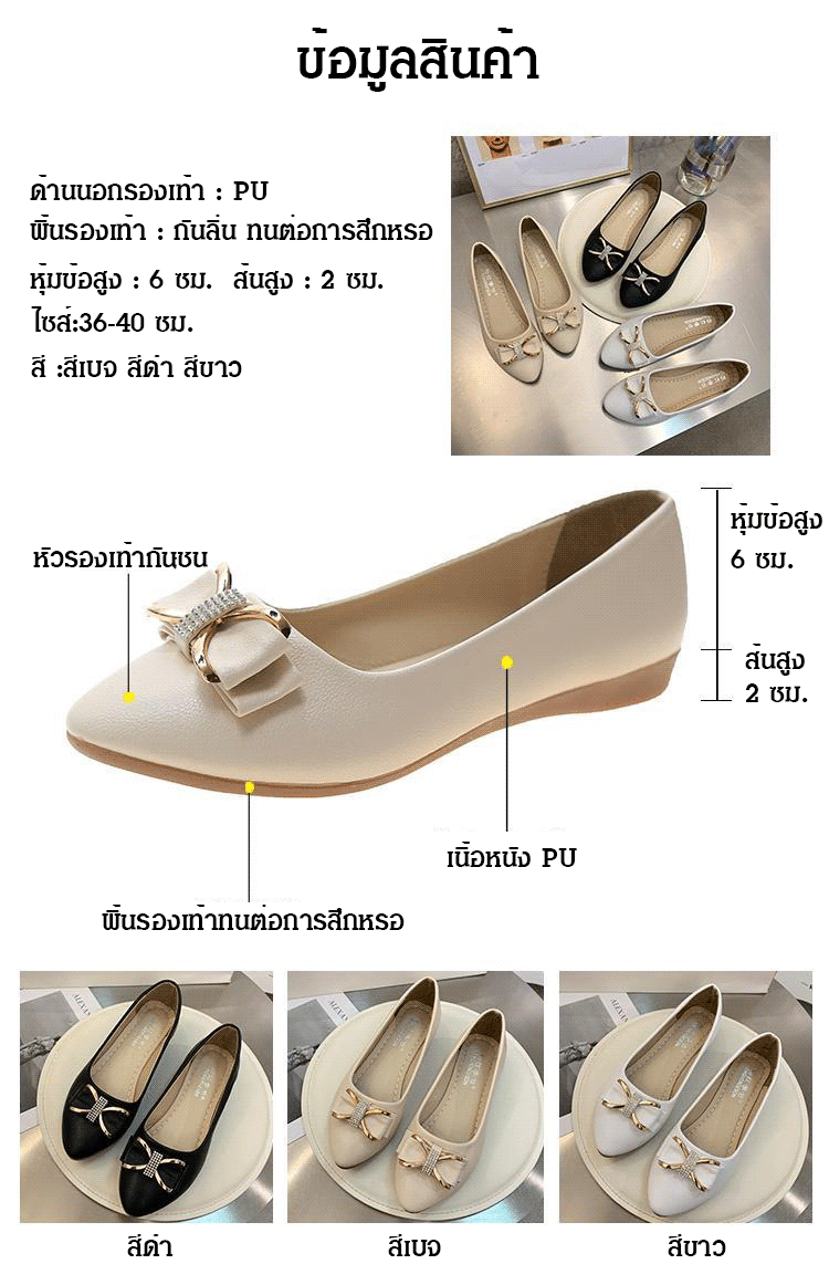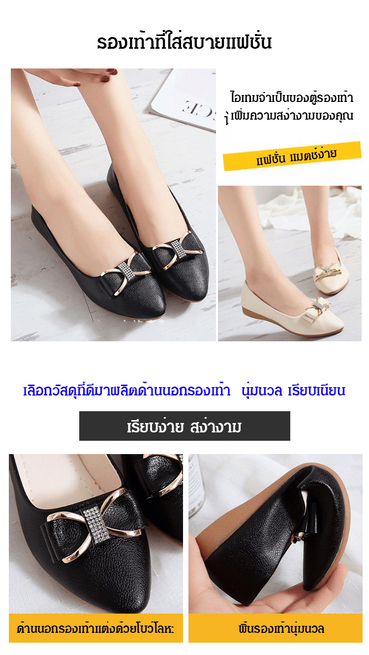 วัสดุหนังวัว พื้นรองเท้าแบน เดินไม่เมื่อย ไม่กัดเท้า ดีไซน์ติดโบว์ สวยงามลดอายุ