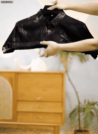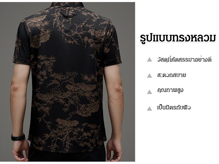 เสื้อเชิ้ตแขนสั้นผ้าไหมเย็นลายเท่ของผู้ชาย